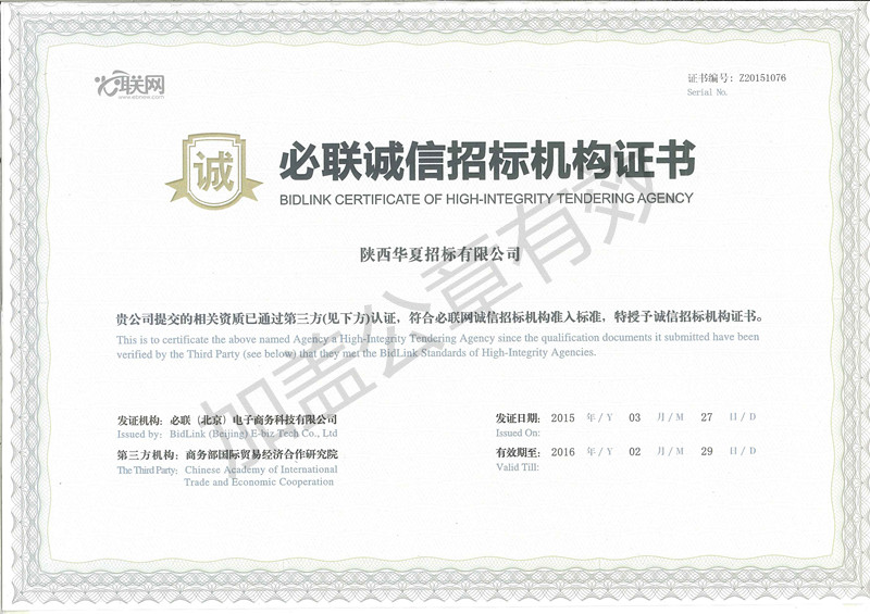 必聯(lián)誠信招標(biāo)機(jī)構(gòu)證書